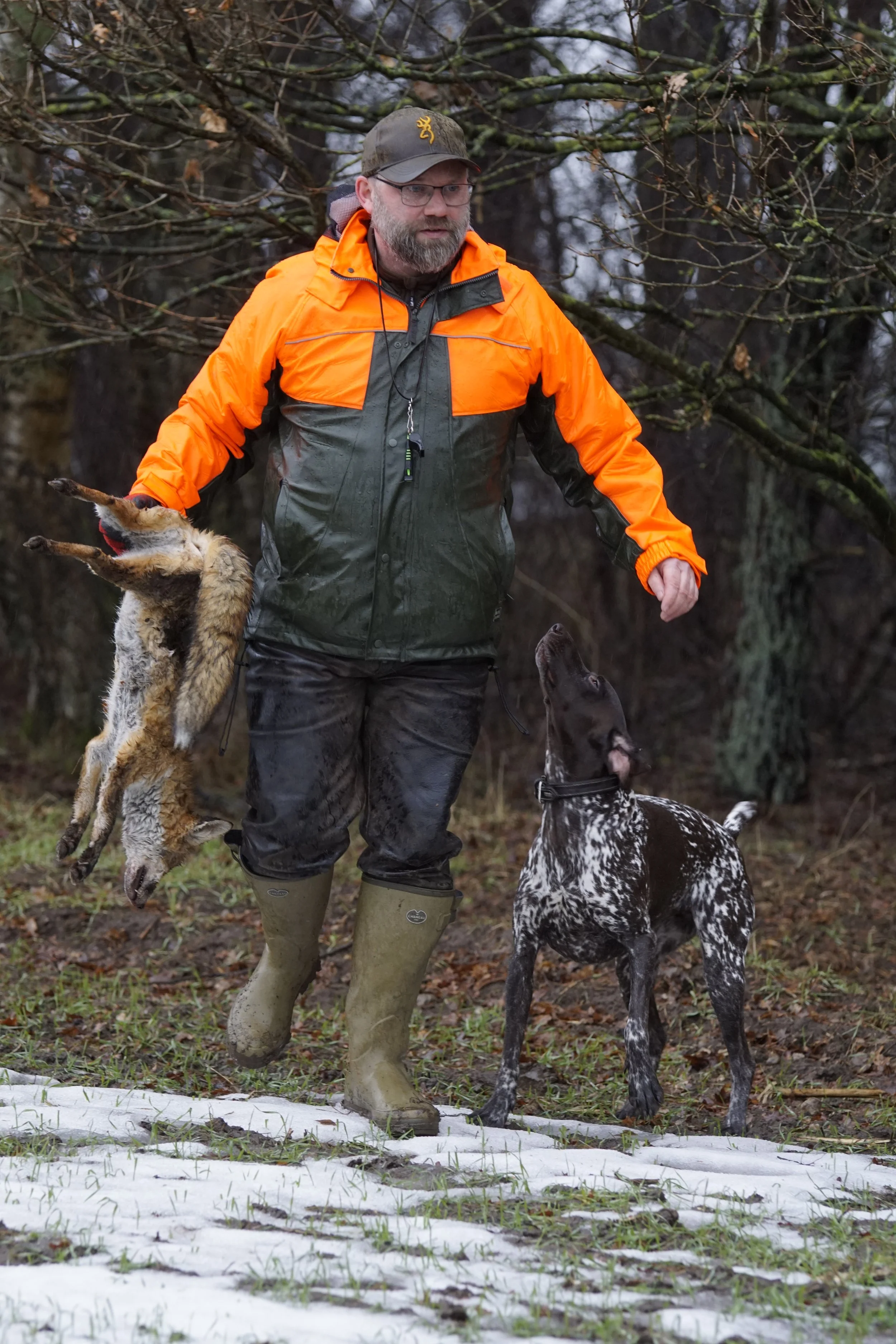 am Sonntag trafen sich Hundeführer, Verbandsrichter, Fotografin sowie die Obfrau für das Prüfungswesen am vereinbarten Treffpunkt in Heimbruch. Insgesamt vier Gespanne waren zur Bringtreueprüfung gemeldet. Schon die Anfahrt ins Prüfungsgelände forderte alle Beteiligten: Tauwetter und Regen machten die Wege anspruchsvoll – aber mit heißem Apfelsaft und Burgern ließ sich die Stimmung zuverlässig auf Betriebstemperatur halten.