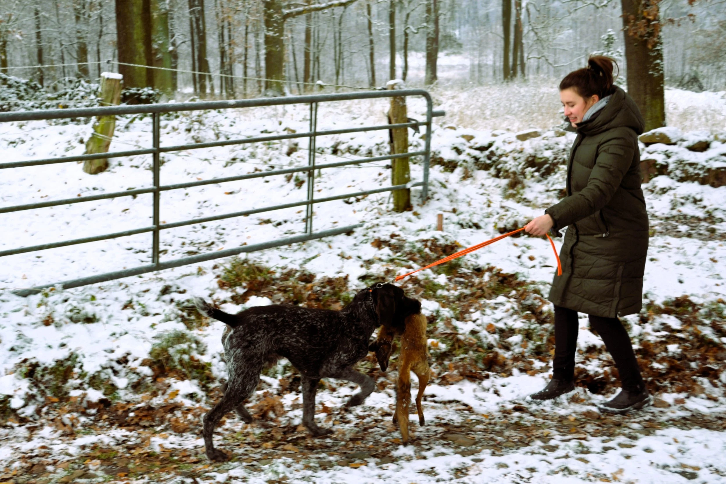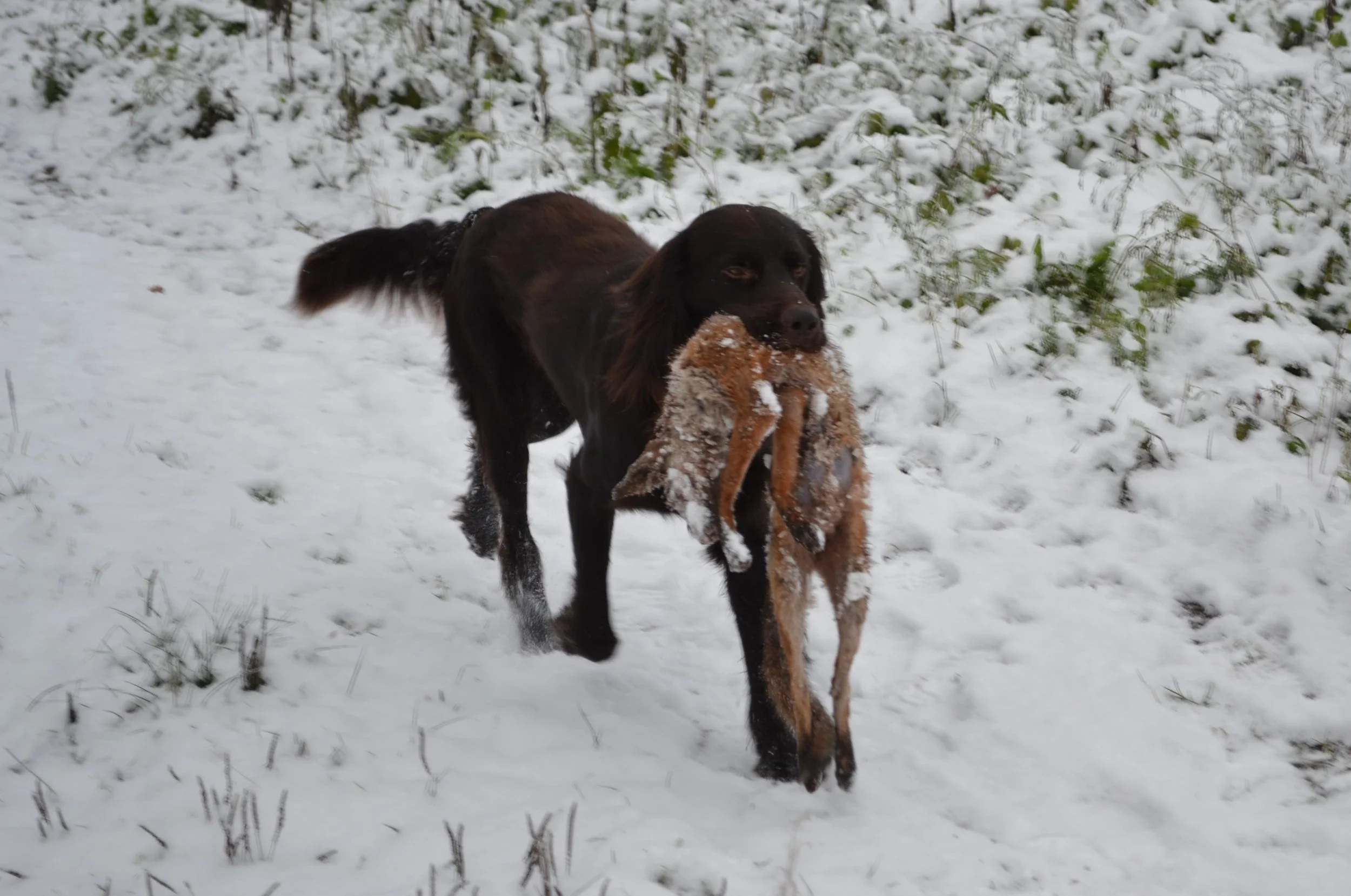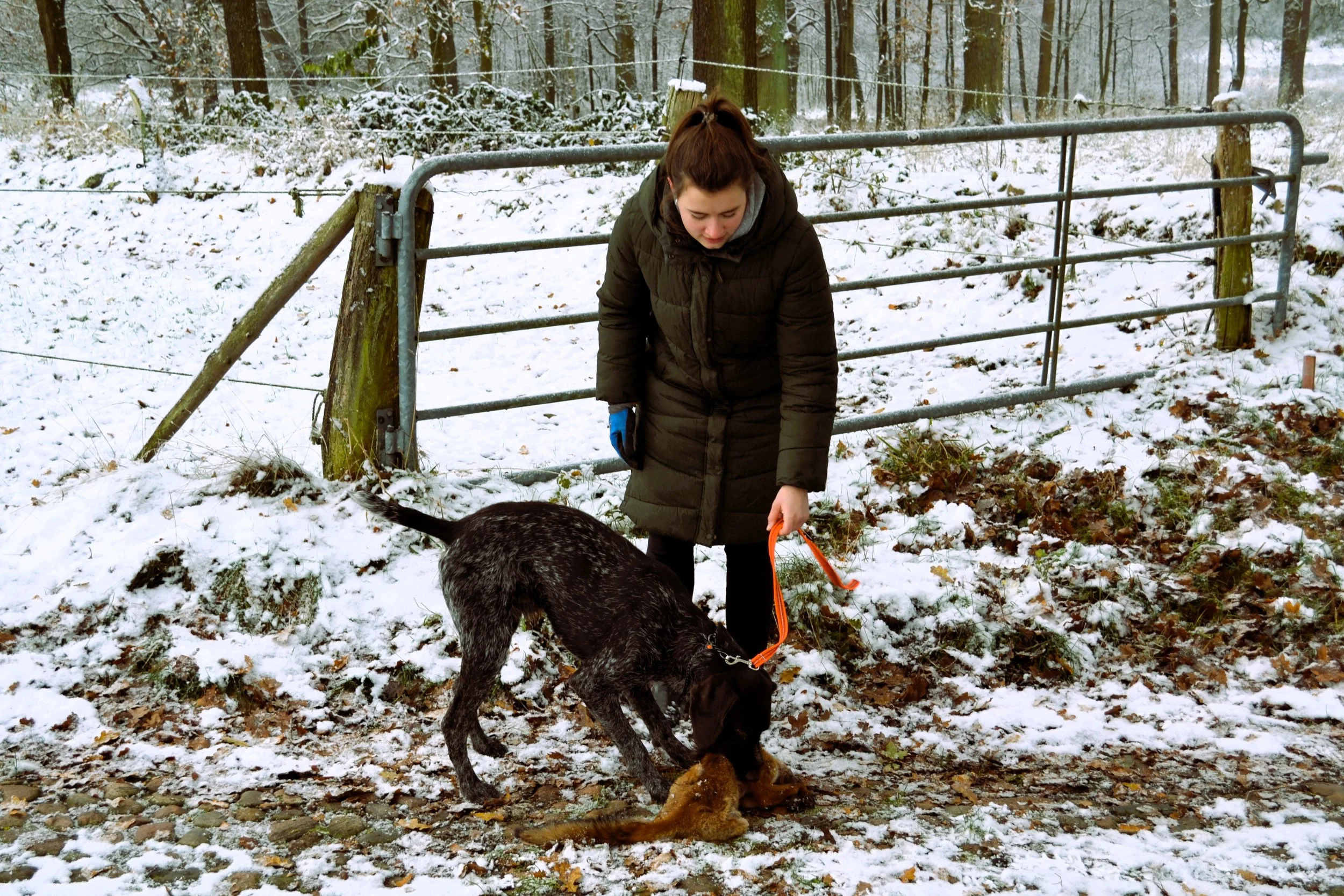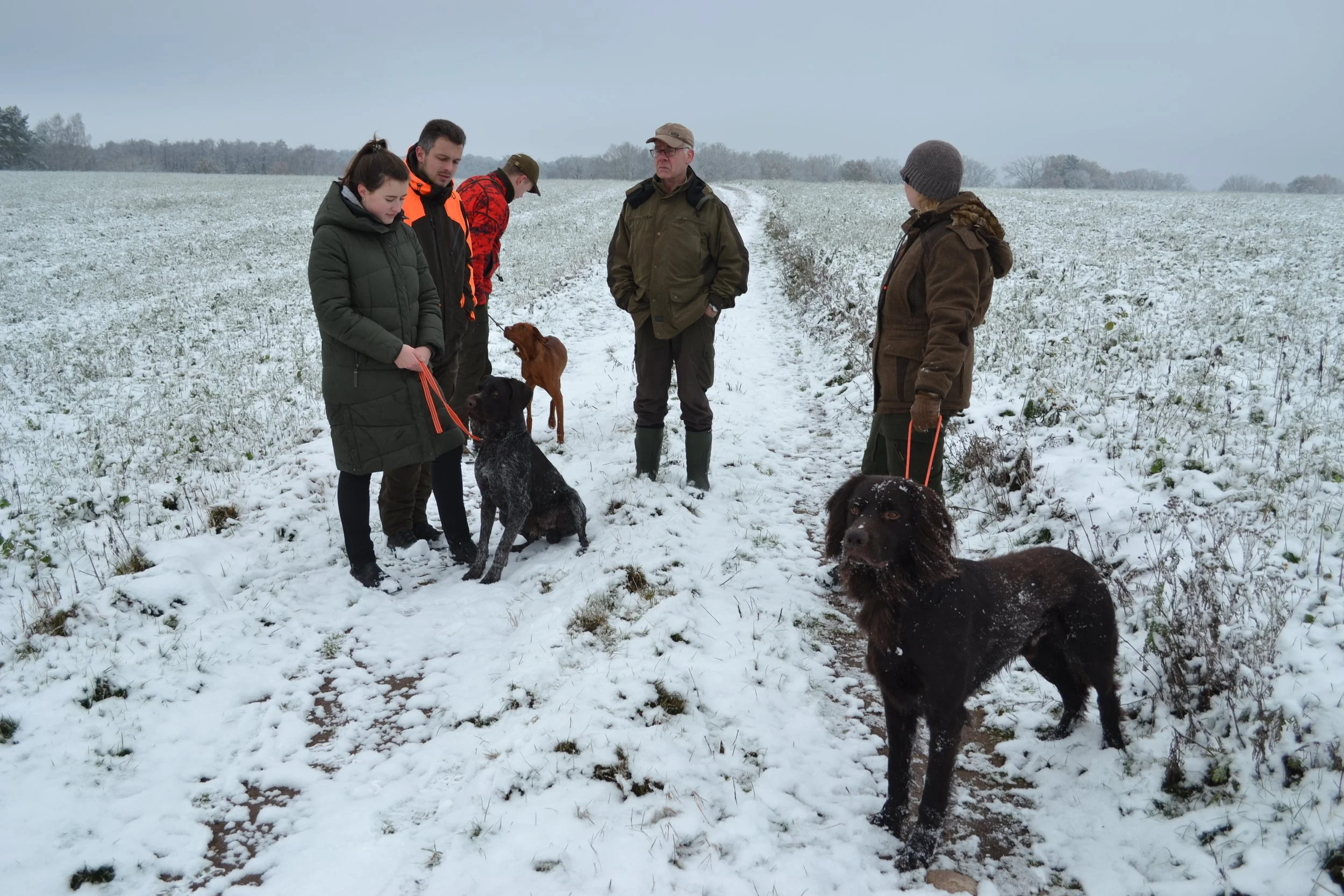 Bei herrlichem Winterwetter vermittelte Gerd den drei zu dieser Ausbildung erschienenen Gespannen zunächst die in der Prüfungsordnung enthaltenen Bestimmungen. Danach ging er auf die praktischen Abläufe der Prüfung ein und erklärte anschließend in der Praxis, wie man den jungen Jagdgebrauchshund zum zuverlässigen Apporteur ausbilden kann.